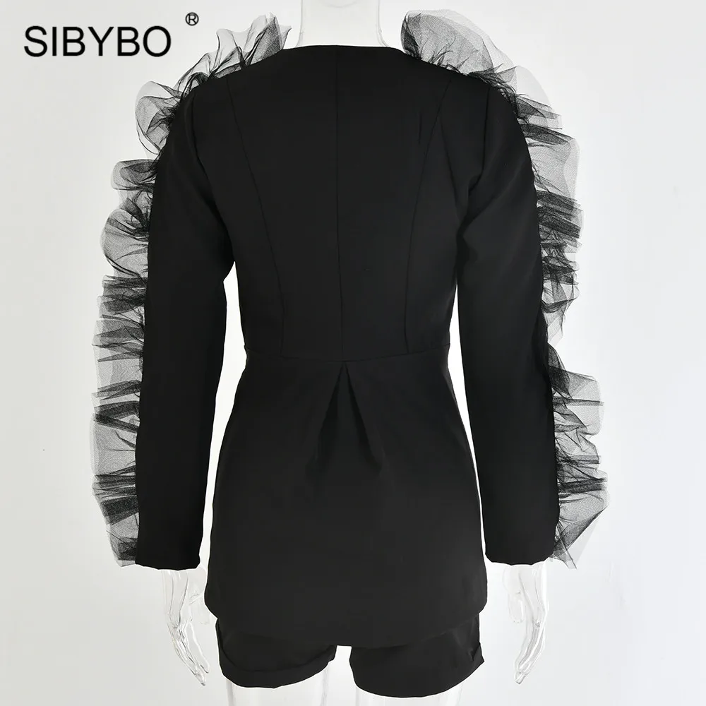 incredible SIBYBO Deep V-Neck Mesh Spliced Sexy Women Blazer and Shorts Set Long Sleeve Spring Two Piece Set W