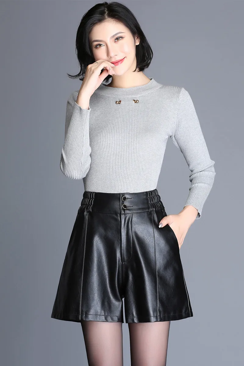 discount Winter Fall Fashion 3XL 4XL Women Black High Elastic Waisted PU leather Shorts Autumn Slim Wide Le